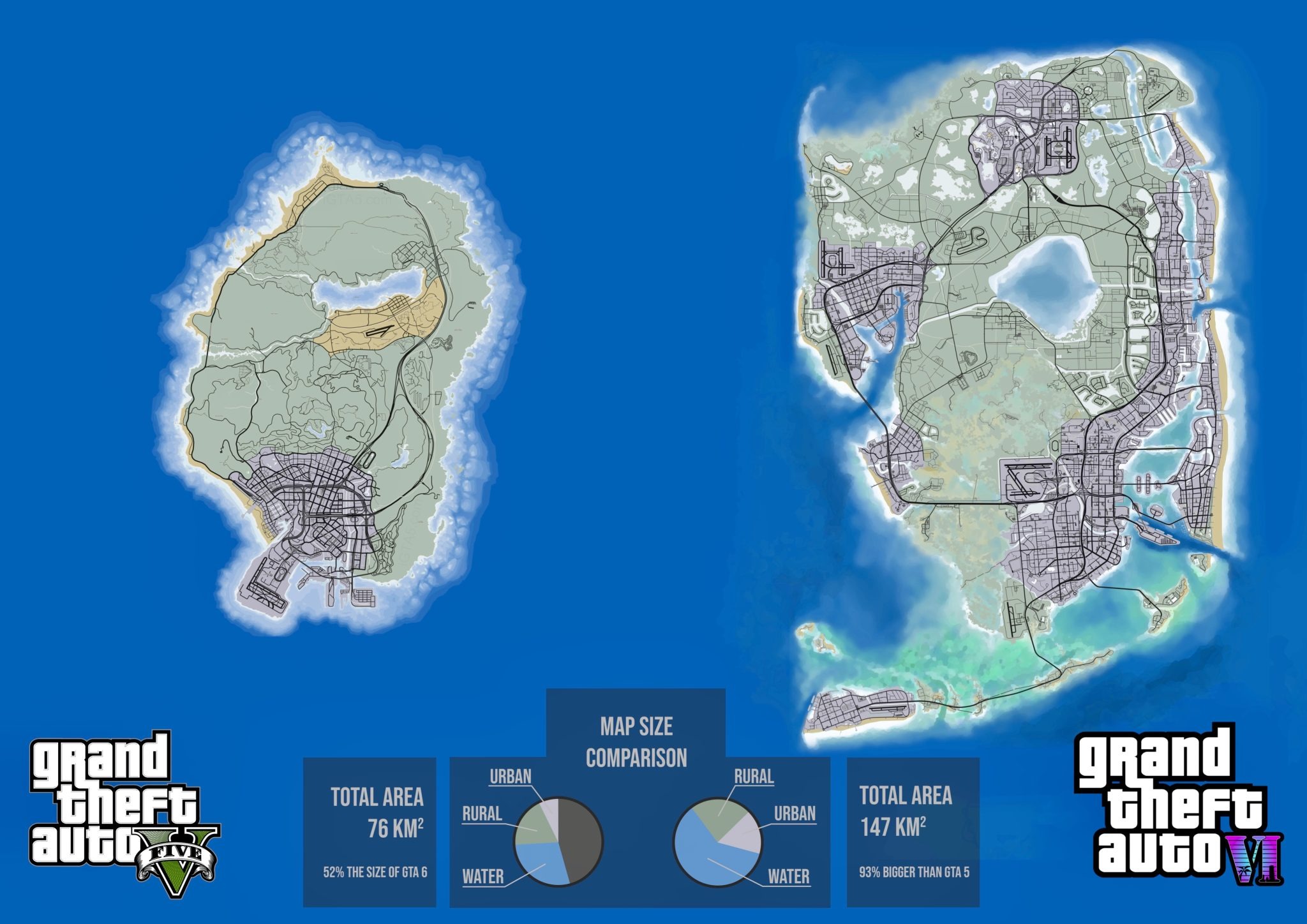 Aktuálne všetko naznačuje tomu, že mapa GTA VI bude najväčšou v sérii. Na oficiálnu mapu od Rockstaru si budeme síce ešte musieť počkať, no pre predstavu už vznikli na internete koláže porovnávajúce mapy GTA 5 a 6. Celé by to potom mohlo vyzerať nasledovne: