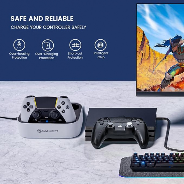 Oba nabíjacie sloty pre PS5 ovládače DualSense/Edge fungujú nezávisle na sebe, a zaisťujú tak ochranu pred prebitím. Akonáhle sa jeden z ovládačov nabije do plna, nabíjací slot sa automaticky vypne, čím udržuje životnosť a ochranu ovládačov.