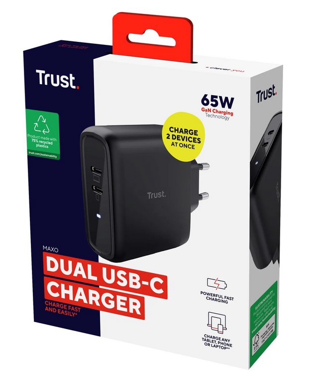 - TRUST MAXO 65W 2P USB-C CHARGER BLK