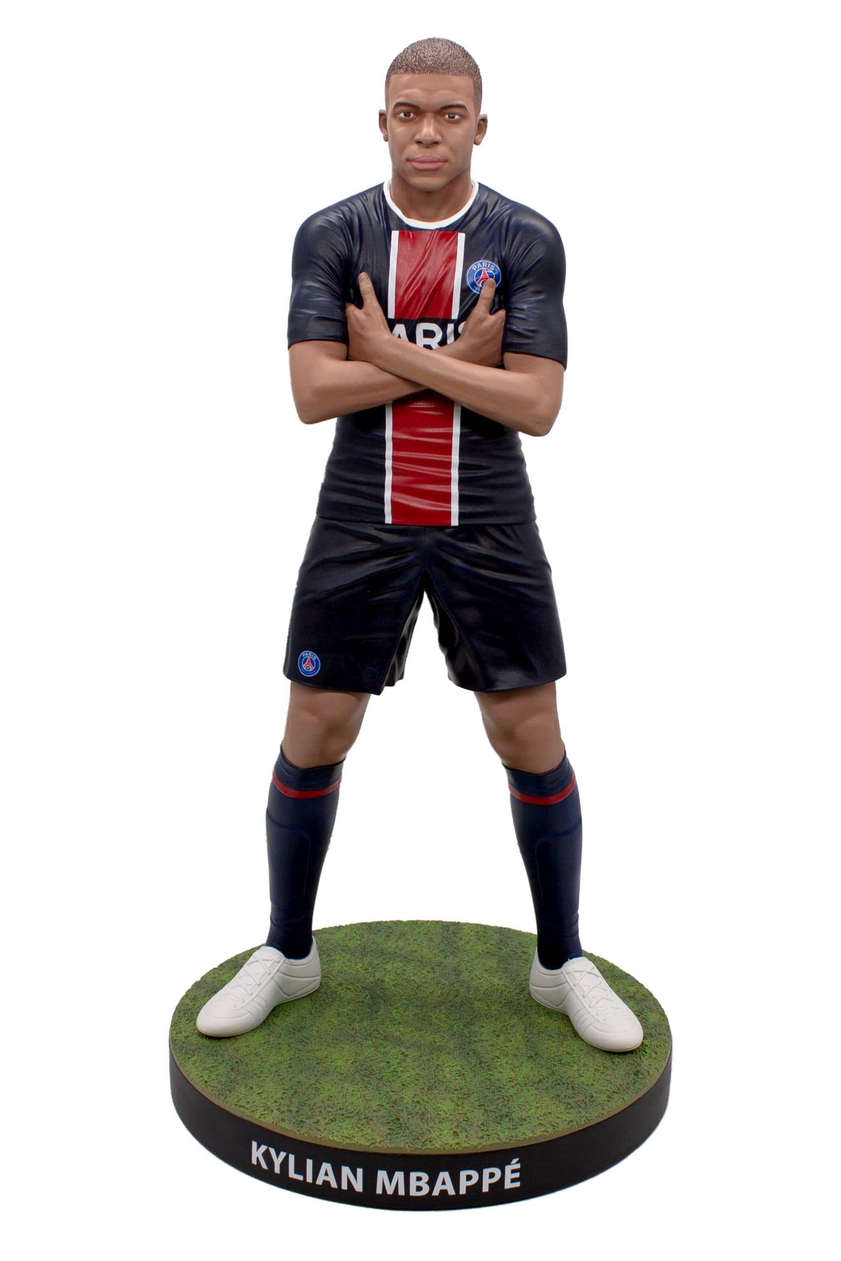 Táto precízne vypracovaná zberateľská socha v mierke 1:3 obsahuje realistickú hlavu s neuveriteľnou podobou Kyliana Mbappého, nadčasový domáci dres PSG, biele kopačky a jeho charakteristickú gólovú oslavu. Socha je vyrobená z kvalitnej živice a je umiestnená na textúrovanom kruhovom podstavci, ktorý pripomína trávnik štadióna Le Parc des Princes.