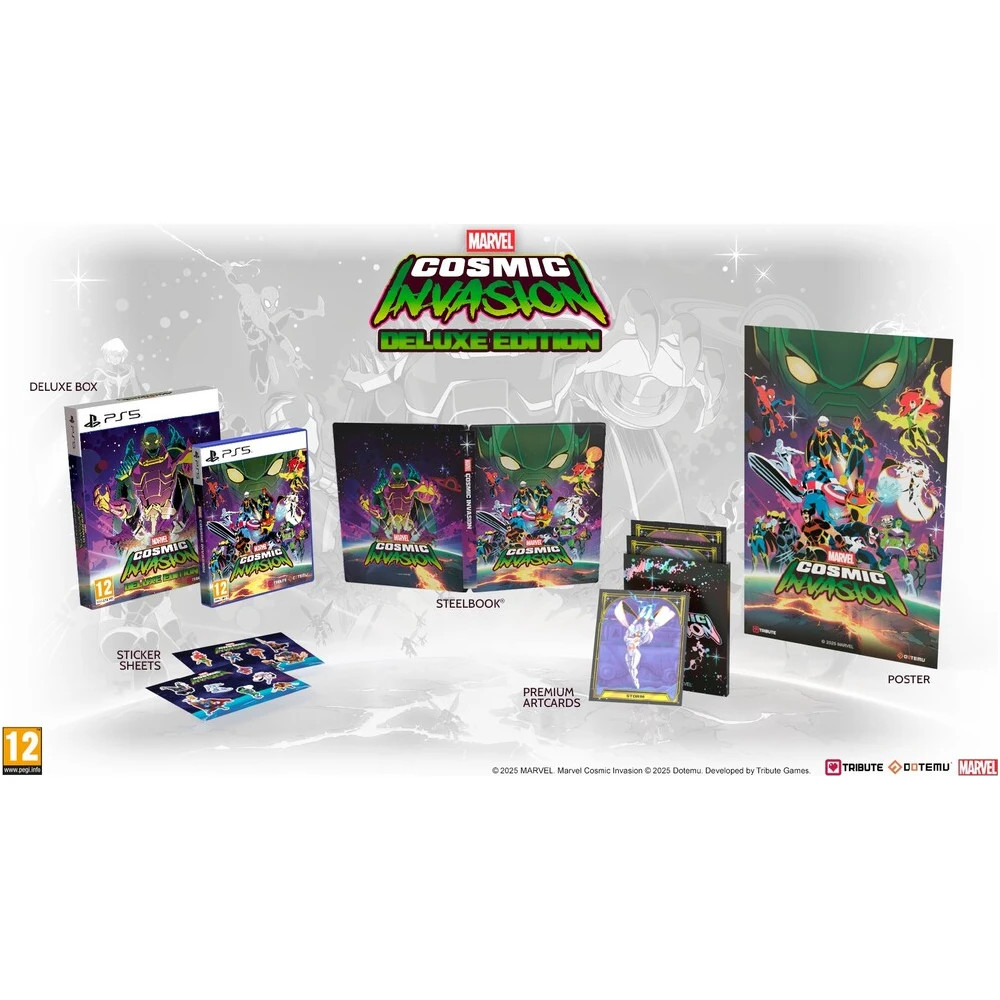 Pre najväčších fanúšikov Marvelu je pripravená Deluxe Edition, ktorá prináša radu exkluzívnych bonusov. Celá edícia je zabalená v prémiovom zberateľskom boxe, ktorý ukrýva fyzickú kópiu hry v unikátnom Steelbooku. Zberateľskú hodnotu zvyšuje sada prémiových art kariet s nádhernými kresbami a originálny plagát s motívmi vesmírnej invázie. Pro personalizáciu vašich doplnkov potom v balení nájdete tiež arky so samolepkami, ktoré oslavujú pixel artový štýl hry.